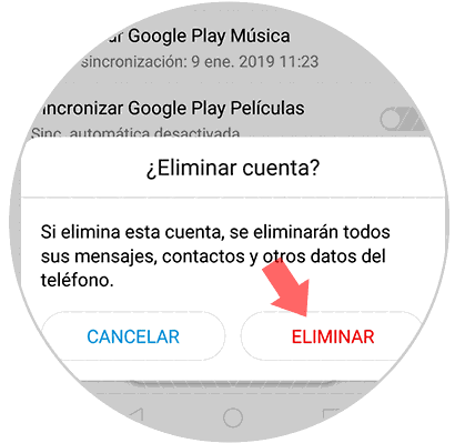 Ahora se desplegará una ventana emergente que nos informa que al borrar la cuenta de manera automática se eliminaran todos los mensajes, contactos, así como cualquier tipo de datos que se encuentre almacenado en el dispositivo, si después de leer este mensaje de advertencia estamos de acuerdo en borrar la cuenta, solo tenemos que seleccionar la ventana que dice “Eliminar”.