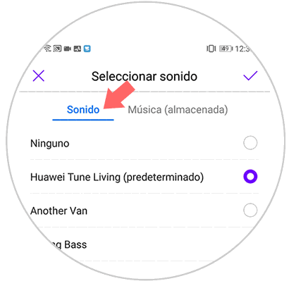 A continuación, aparecerás en una sección de nombre “Seleccionar sonido”, en caso de que quieras colocar un tono predeterminado que posea el teléfono móvil, tienes que darle en “Sonido” y elegir el que más te guste (es recomendable colocar una tonalidad fuerte que te alerte cuando recibas una llamada).