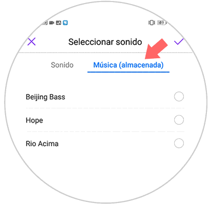 Si por el contrario del paso anterior, quieres seleccionar una música o tono que has descargado en tu dispositivo, tienes que ir hacia la sección que está justo al lado de “Sonido” conocida como “Música (almacenada)”. En esta última, veras todas las canciones o tonalidades que has obtenido para tu dispositivo móvil, solo tienes que escoger una que desees y darle en el botón de “Aceptar” que se encuentra en la parte superior derecha de la pantalla.