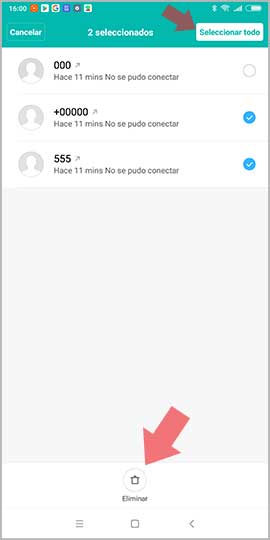 A continuación vas a ver que aparece el listado con todas las llamadas registradas en tu móvil. Debes seleccionar aquellas que quieres borrar, y pulsar el botón de la parte inferior que pone "Eliminar"