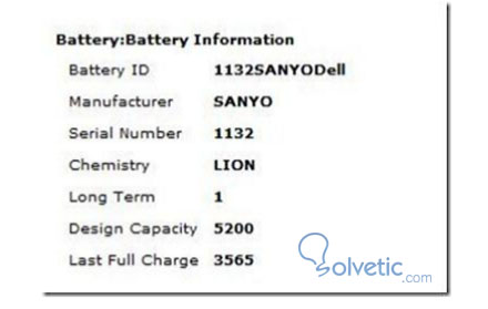 Esto muestra el ID de la batería, el nombre del fabricante, el tipo de compuesto químico de la batería, la capacidad máxima diseñada y la última carga completa que es la capacidad actual de la batería.