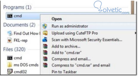 - Abramos una consola de comando con permiso de administrador, escribiendo cmd en el buscador del menú de inicio y luego haciendo click derecho sobre el programa y elegir los permisos de administrador.