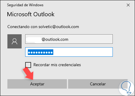Ingresamos la contraseña de la cuenta seleccionada. Pulsamos en "Aceptar" y esperamos que el proceso finalice para agregar la cuenta de Exchange en Outlook 2019.