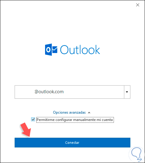 Se desplegará el siguiente asistente donde ingresaremos la cuenta de Exchange a añadir y debemos activar la casilla "Permitirme configurar manualmente mi cuenta" ubicada en la sección "Opciones avanzadas". Allí pulsamos en el botón "Conectar".