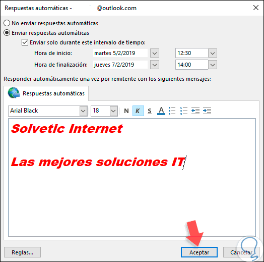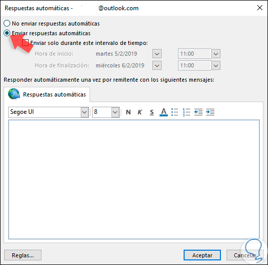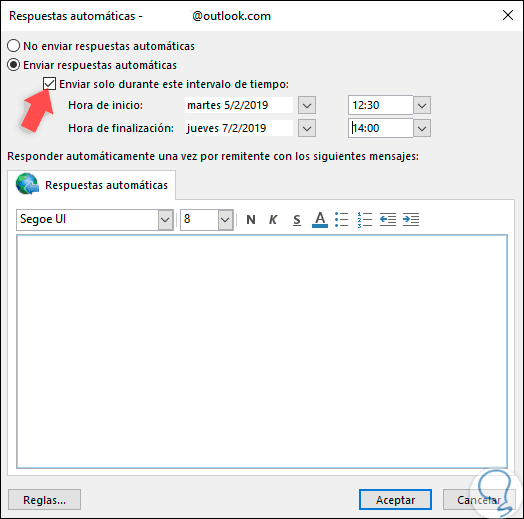 Si activamos la casilla "Enviar solo durante este intervalo de tiempo" será posible indicarle a Outlook 2019 que envíe las respuesta solo en el rango de tiempo indicado, pueden ser días y horas: