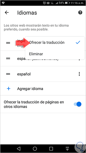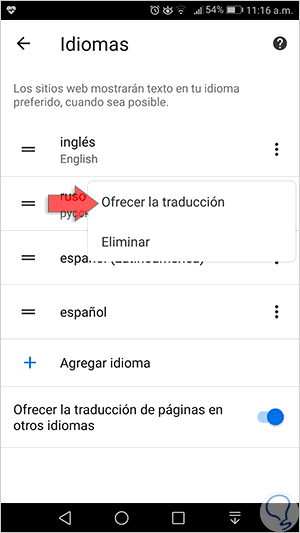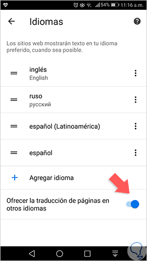 En la ventana desplegada, para activar el traductor debemos pulsar el interruptor “Ofrecer la traducción de páginas en otros idiomas”: