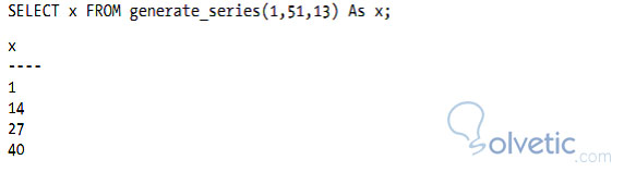 Otra de las buenas caracteristicas de PostgreSQL y que no se conocen en otros manejadore, es la función gerenate_series(), que nos permite crear nuestras secuencias indicando el inicio y fin y además el salto entre un paso y otro, para lograr algo similar en otro manejador tendríamos que utilizar LOOPS y otras herramientas para poder lograr un resultado similar.