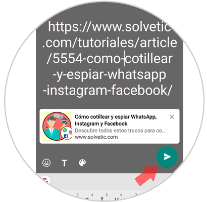 Verás que se abre la ventana de estados de WhatsApp. Puedes seleccionar en la parte inferior las diferentes opciones de personalización como color, emojis…Finalmente pulsa en el símbolo de enviar situado en la parte inferior y el link habrá quedado publicado en tu estado de WhatsApp.