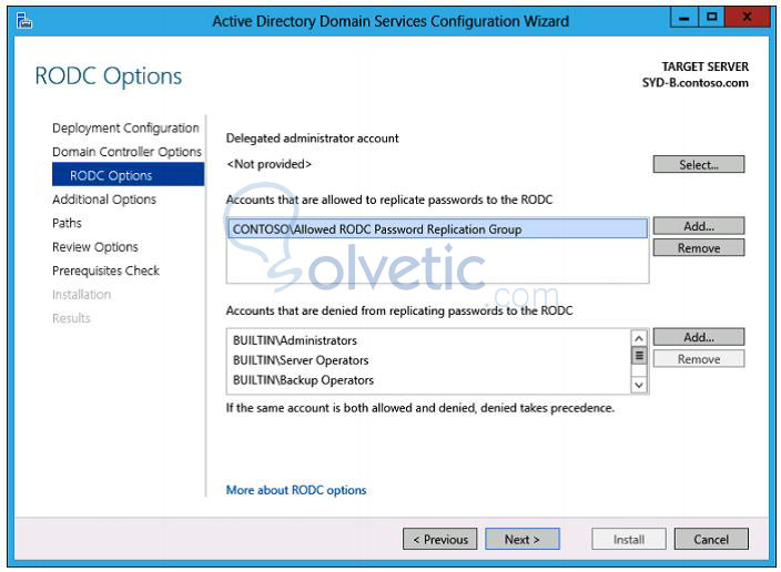- 4 - En la página de opciones del controlador de dominio de solo lectura, establecer la lista de cuentas que pueden hacer réplica al nuevo controlador de dominio de solo lectura, también podremos establecer las cuentas que están bloqueadas de hacer dicha réplica.