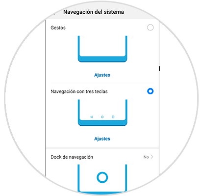 Se mostraran 3 alternativas con las que se pueden configurar el tipo de navegación que se desea colocar en el Honor 10 Lite, entre las cuales se encuentran: Gestos, Navegación con tres teclas, y Dock de navegación.