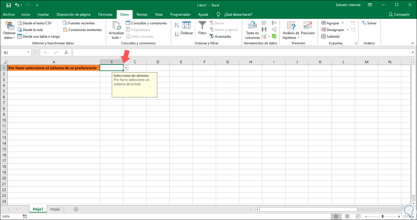 En la celda B1 se creará la celda desplegable la cual permite que el usuario solo tenga la oportunidad de elegir alguno de los valores allí descritos y no agregar o eliminar alguna de las opciones suministradas por el creador de la celda.