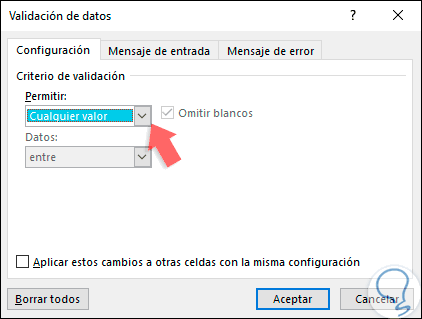 En el momento que consideremos que no se necesita más la lista desplegable, debemos eliminarla, para ello será necesario eliminar la regla de validación de datos, esto se logra desde la opción “Validación de datos” en el menú “Datos” y en el campo “Permitir” seleccionamos la opción “Cualquier valor”. Pulsamos en Aceptar para aplicar los cambios.