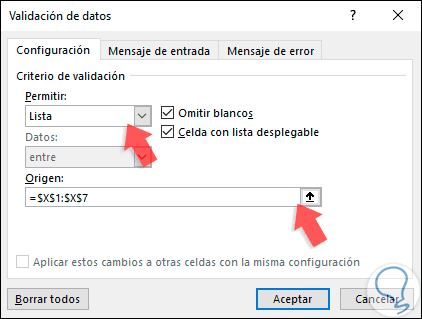 - En el campo “Origen” seleccionamos la tabla o el rango de celdas donde están los valores a desplegar.
