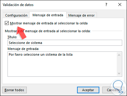 Ahora vamos a la pestaña “Mensaje de entrada” y allí asignamos un título y un mensaje el cual será desplegado al usuario cuando pase el mouse sobre la celda desplegable.
