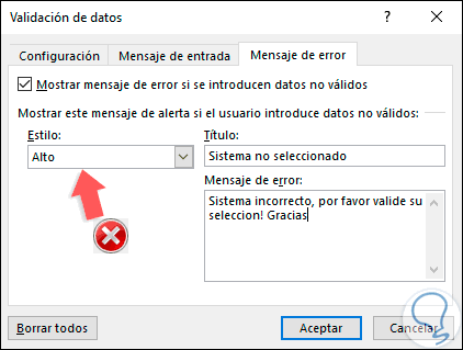 Ahora vamos a la pestaña “Mensaje de error” y allí asignamos el título del mensaje e ingresamos el mensaje que será desplegado si el usuario se equivoca en su seleccione, en la parte lateral izquierda podemos seleccionar el tipo de icono a desplegar: