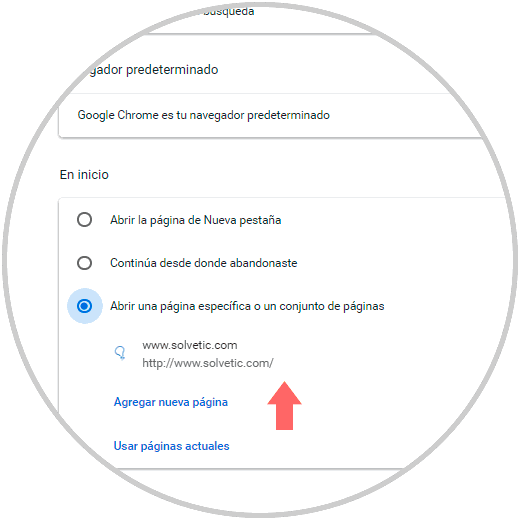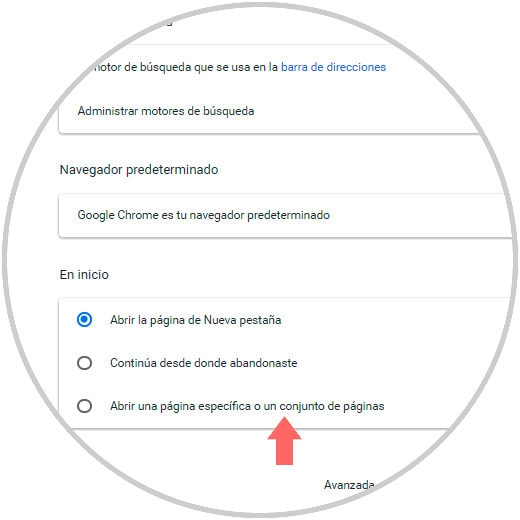 Allí buscamos la opción “En inicio” y damos clic sobre la sección “Abrir una página especifica o un conjunto de páginas”: