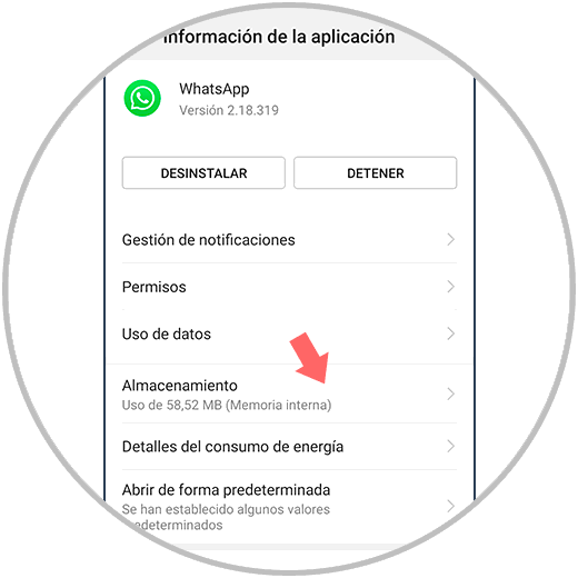 A continuación, te aparecerá toda la información referente a eta app. Deberás pulsar sobre “Almacenamiento”, que se encuentra debajo del uso de datos.