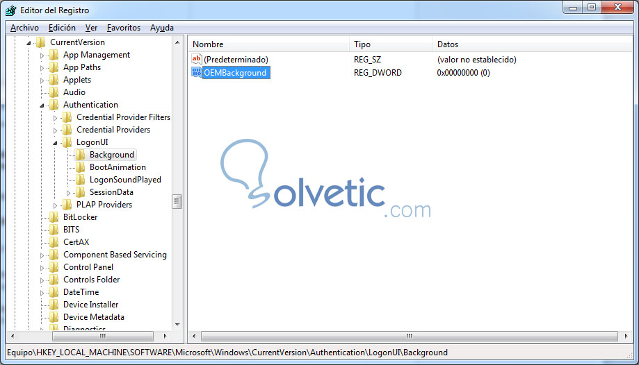 - HKEY_LOCAL_MACHINE / SOFTWARE / Microsoft / Windows / CurrentVersion / Authentication / LogonUI / Background.