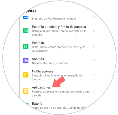 A continuación, debes buscar la pestaña de “Aplicaciones”, la cual posee un icono amarillo y se encuentra debajo de “Notificaciones” y por encima de la opción de “Batería”.