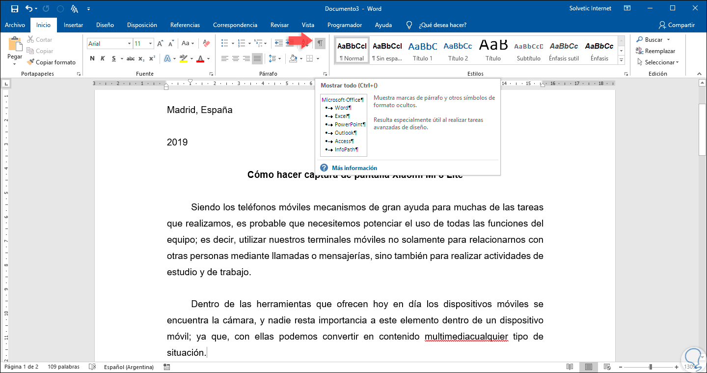 - Desde el menú Inicio, grupo Párrafo y allí dar clic en el icono Mostrar todo