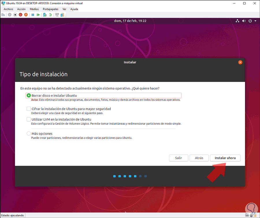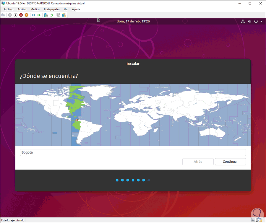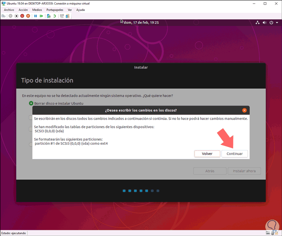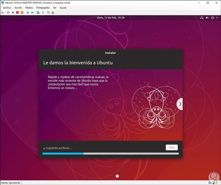 Damos clic en Continuar y se dará inicio al proceso de instalación y configuración de Ubuntu 19.04 en Hyper-V: