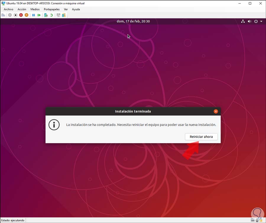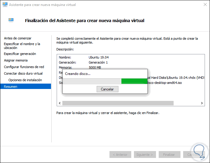 Pulsamos en Finalizar para completar el proceso y crear la maquina virtual de Ubuntu 19.04: