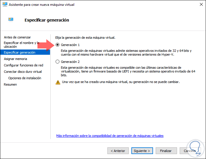Damos clic en Siguiente y en la próxima ventana definimos la generación de la maquina virtual, la principal diferencia radica en que la generación 2 solo admite sistemas operativos de 64 bits y está basado en UEFI lo cual puede afectar equipos más antiguos, por ello seleccionamos la Generación 1: