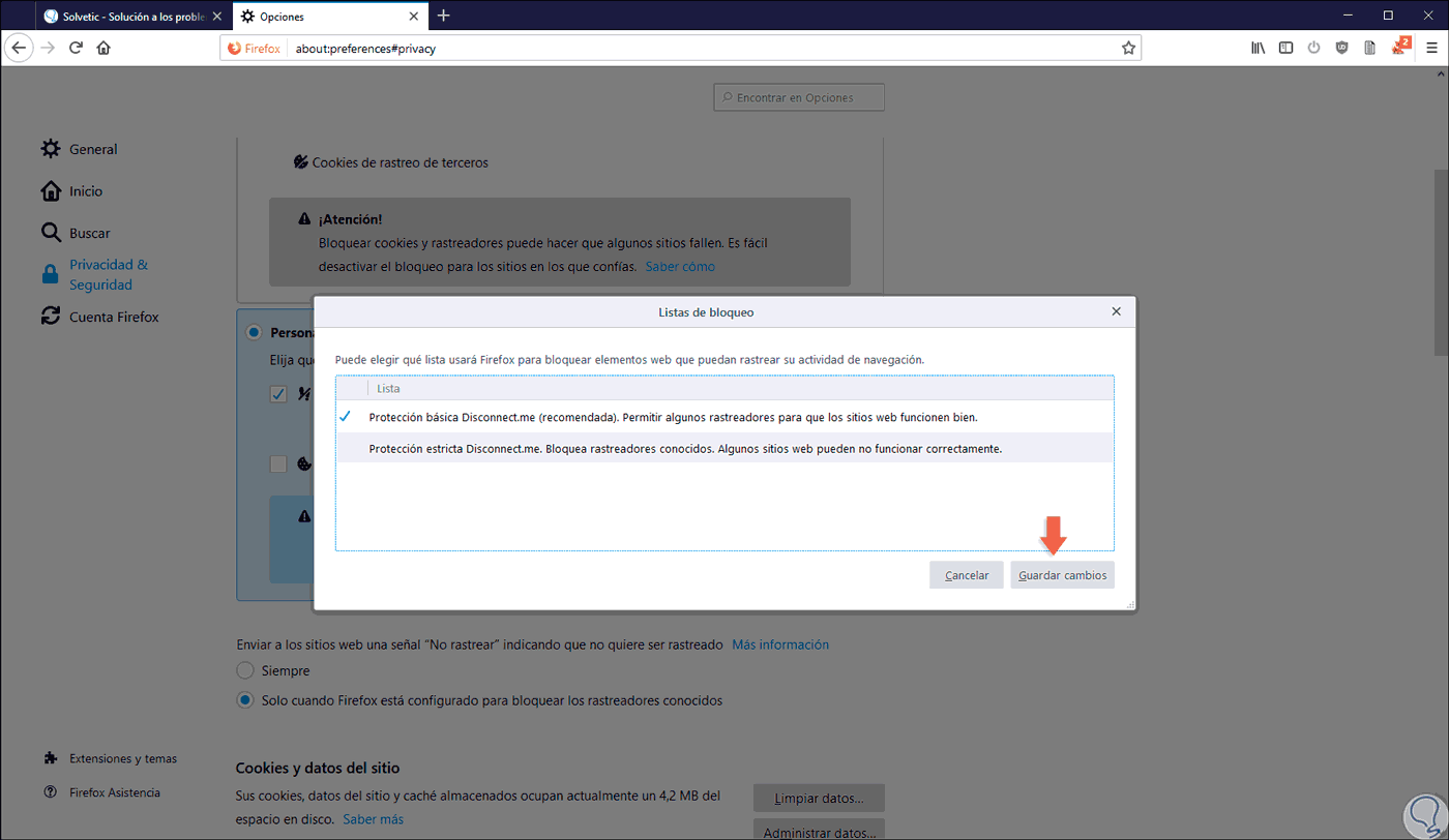 Para el caso de las cookies, sera posible bloquear rastreadores de terceros, cookies de sitios web no visitados, todas las cookies de terceros o todas las cookies si es el caso. En el nivel personalizado disponemos de una línea llamada “Cambiar la lista de bloqueo” la cual nos ofrece dos listas de seguimiento diferentes para bloquear los rastreadores de Firefox. Estas son de forma predeterminada administradas por Disconnect.me: