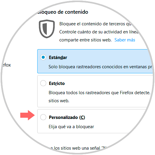 Allí dispondremos de los tres niveles de bloqueo disponibles. Basta con activar la casilla correspondiente y en el caso del nivel personalizado será posible activar tanto el bloqueo de los rastreadores como de las cookies, así como definir si este bloqueo afectará solo las ventanas emergentes o todas las ventanas de Firefox: