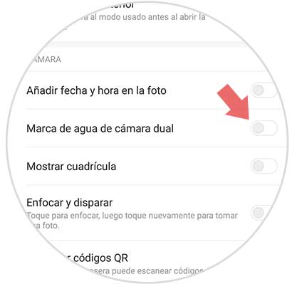Posteriormente, se desplegará una ventana emergente con una lista de ajustes que pueden ejecutarse en la cámara, entre estas tenemos: Añadir fecha y hora de foto, marca de agua de cámara dual, Mostrar cuadrícula, y Enfocar y disparar, debiendo seleccionar la alternativa “Marca de agua cámara dual”, para ello se mueve hacia la derecha un pequeño botón que se encuentra al lado del apartado.