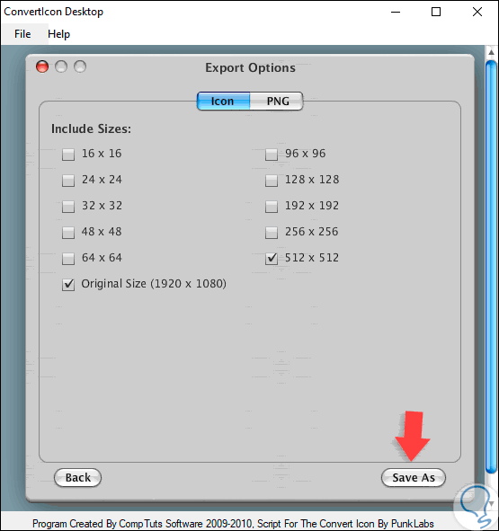 En la siguiente ventana activamos la pestaña correspondiente ICO y definimos el tamaño en el cual deseamos la conversión:
