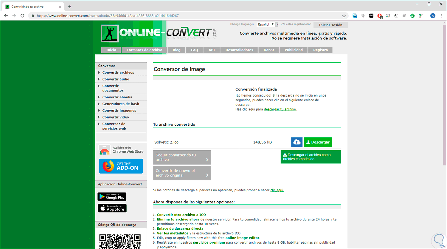 Definidos estos parámetros pulsamos en el botón "Iniciar conversión" y veremos que el archivo seleccionado ha sido convertido a .ico: