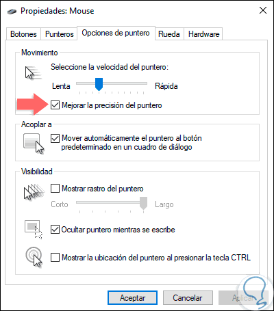 Allí definiremos la sensibilidad en la sección “Movimiento” usando la barra deslizante y para mejores resultados podemos activar la casilla “Mejorar la precisión del puntero”. Una vez realizado esto pulsamos en Aplicar y Aceptar para guardar los cambios.