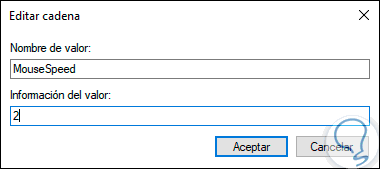 Allí ubicamos el valor “MouseSpeed”, damos doble clic sobre él y en el campo “Información del valor” establecer el numero 2. Pulsamos en Aceptar para guardar los cambios.