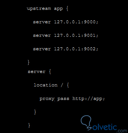 Vemos como definimos tres servidores en un bloque upstream llamado app, luego en nuestro bloque server hacemos un proxy_pass al bloque app, lo que va a hacer Nginx es utilizar el esquema de round robin para ir sirviendo las peticiones a los tres servidores upstream que definimos, logrando de esta manera el objetivo; Adicionalmente, Nginx también puede manejar otros algoritmos de balanceo de carga.