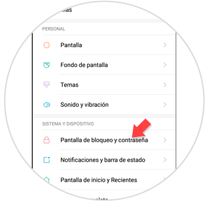 Posteriormente, se desplegará un menú con varias alternativas entre las cuales debemos seleccionar la opción “Pantalla de bloqueo y contraseña”.