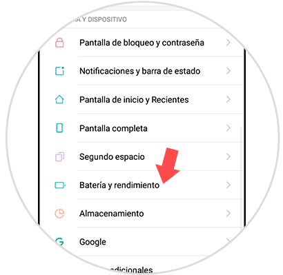 A continuación, debes desplazarte entre todas las opciones de las configuraciones del terminal hasta encontrar el apartado que dice "Batería y rendimiento" para seleccionarlo.