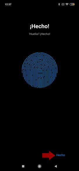 Cuando este proceso haya finalizado y la huella se haya podido configurar completamente, debes seleccionar la opción “Hecho” que aparece la parte inferior de la nueva pantalla.