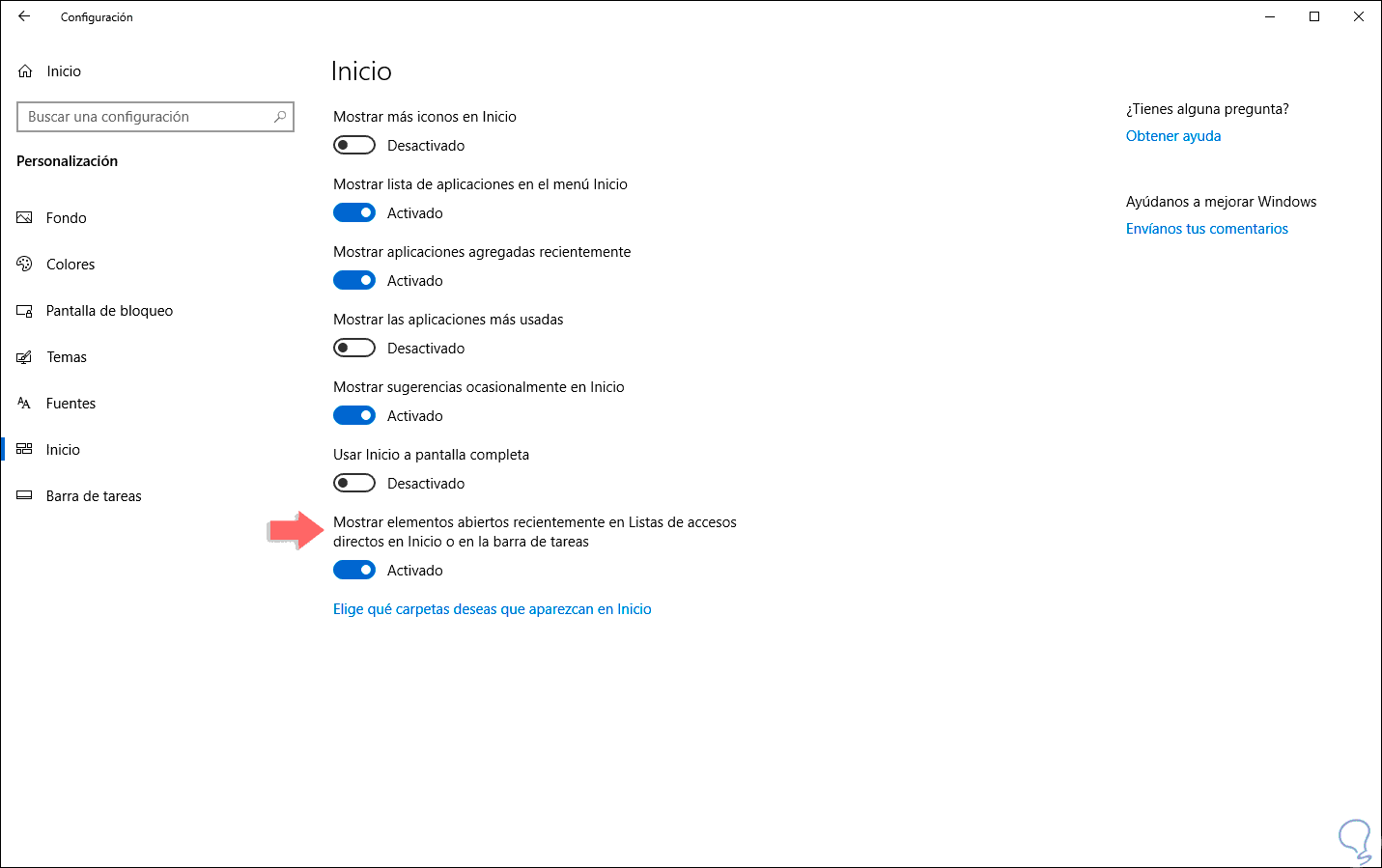 Allí vamos a la sección “Personalización” y en la ventana desplegada iremos a la sección “Inicio” donde debemos validar que la opción “Mostrar elementos abiertos recientemente en Listas de accesos directos en Inicio o en la barra de tareas” se encuentre activa: