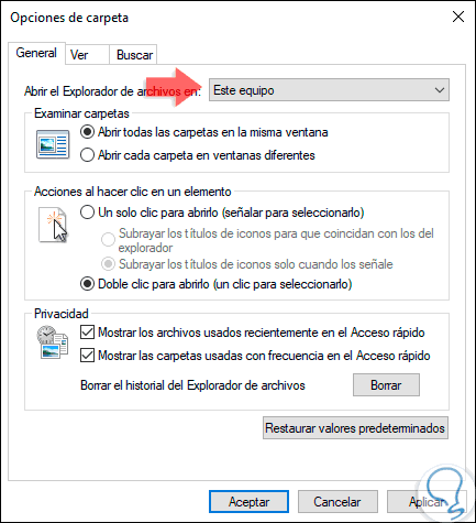 Ahora, en la pestaña “General” vamos a la sección “Abrir el Explorador de archivos en” y allí, en el campo desplegable seleccionamos “Este equipo”: