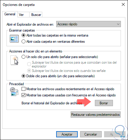 En algunas oportunidades con borrar el historial del Acceso rápido basta para corregir el error de despliegue de los archivos recientes. Para borrar este historial iremos de nuevo a las propiedades de carpeta como hemos visto anteriormente y allí debemos pulsar en el botón “Borrar” ubicado en la sección “Privacidad”:
