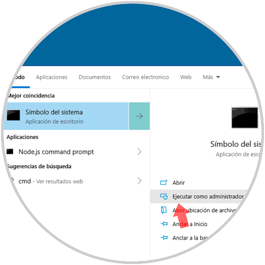 Debemos acceder como administradores y para ello buscamos el símbolo del sistema en el cuadro de búsqueda de Windows 10 y allí lo ejecutamos usando alguna de las siguientes alternativas: