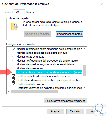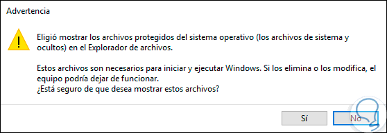 Allí damos clic sobre “Opciones del Explorador de archivos” y en la ventana emergente desplegada vamos a la pestaña “Ver” y allí desactivamos la casilla “Ocultar archivos protegidos del sistema operativo” y se desplegara la siguiente advertencia: