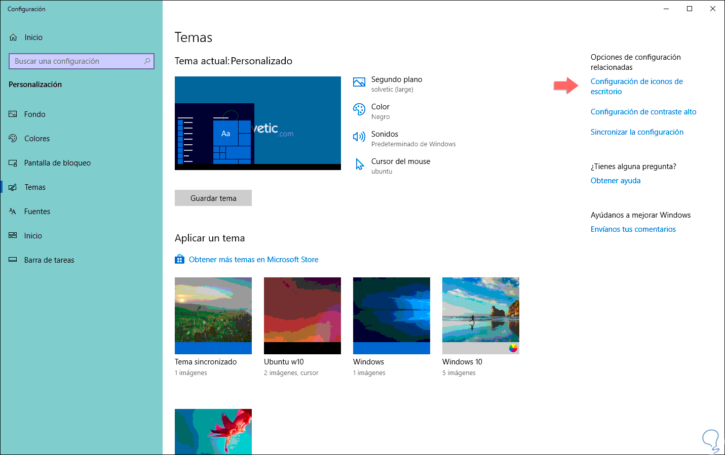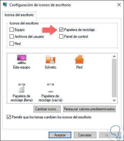 Allí damos clic en la línea “Configuración de iconos de escritorio” y en la ventana desplegada activamos la casilla “Papelera de reciclaje”. Nuevamente pulsamos en Aplicar y Aceptar para guardar los cambios.