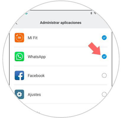 En el listado de aplicaciones selecciona WhatsApp pulsando sobre esta opción y quedará marcada en color azul.