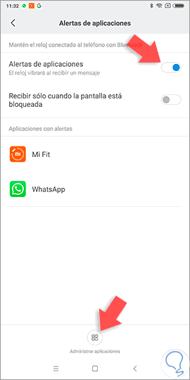 Ahora, activa la pestaña “Alerta de aplicaciones” para recibir notificaciones de aplicaciones en tu Mi Band 3. Para seleccionar las Apps de las cuales quieres recibir notificaciones pulsa en “Administrar aplicaciones” en la parte inferior de la pantalla.