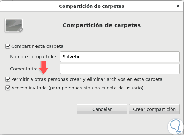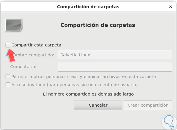 Definido esto damos clic en el botón “Crear compartición” para que esta carpeta sea compartida en Linux, veremos el siguiente mensaje: