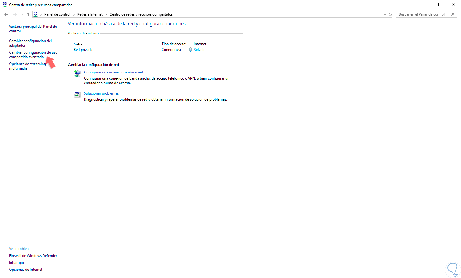 Damos clic en la línea “Centro de redes y recursos compartidos” y en la siguiente ventana daremos clic en la línea “Cambiar configuración de uso compartido avanzado”: