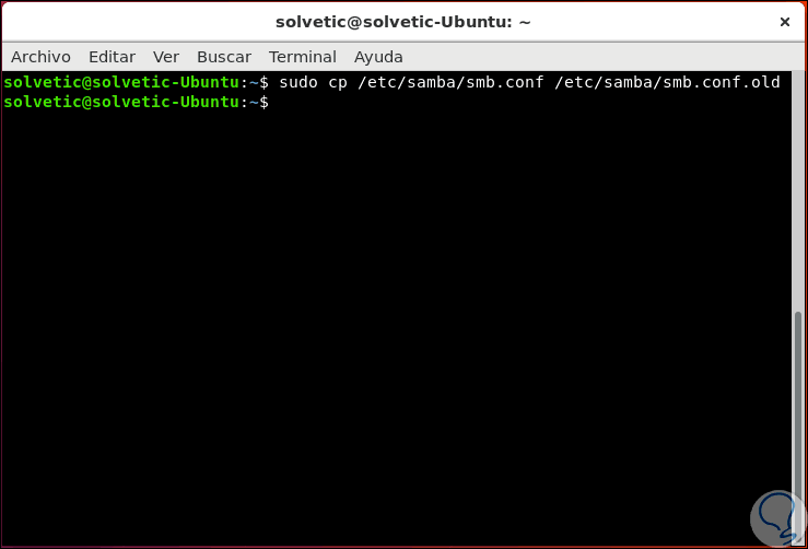 A continuación, vamos a crear una copia del archivo de configuración de Samba ejecutando la siguiente línea:
