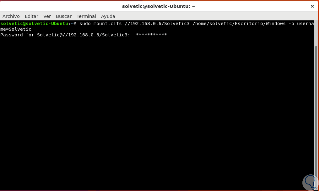sudo mount.cifs //192.168.0.6/Solvetic3 /home/solvetic/Escritorio/Windows –o user=solvetic